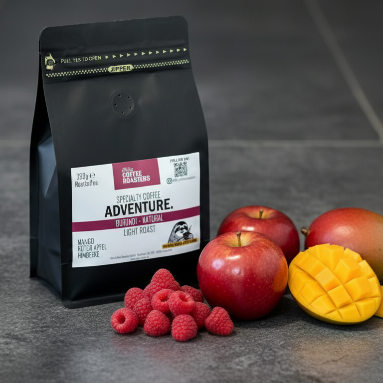 Der "Adventure" ist unser neuer, hell gerösteter Natural aus Burundi – eine wahre Entdeckungsreise für alle, die fruchtige, lebhafte Kaffees schätzen. Mit seinen klaren, spritzigen Noten von Himbeere und rotem Apfel sowie einer an Mango erinnernden Süße präsentiert er sich als perfekte Fruchtbombe. Ob als Filterzubereitung, bei der seine Aromatik subtil und elegant zur Geltung kommt, oder als kompromisslos fruchtiger Espresso: „Adventure“ bietet außergewöhnliche Geschmackserlebnisse jenseits des Gewohnten.