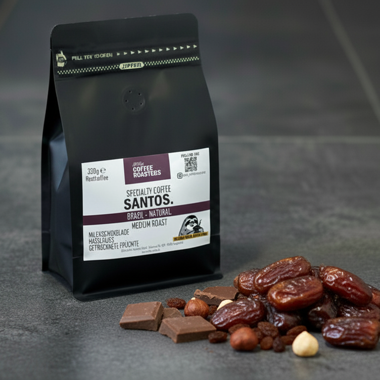 Der "Santos" ist unser brasilianischer Klassiker mit mittlerer Röstung – angenehm nussig, milchschokoladig und mit dezenter Säure, die an getrocknete Früchte erinnert. Als Filterkaffee liefert er ein wunderbar rundes, ausgewogenes Aroma ohne störende Säuren oder harte Bittertöne. Wer es als Espresso versucht, entdeckt einen leicht lebendigeren Charakter als bei typischen Robusta-Blends, jedoch weiterhin mit geringer Säure und sanfter Süße. Mit Milch wird er besonders cremig. Unsere Empfehlung für Espresso: 1:2–1:2,5 bei 92–94°C, 26–30 Sekunden Durchlaufzeit.